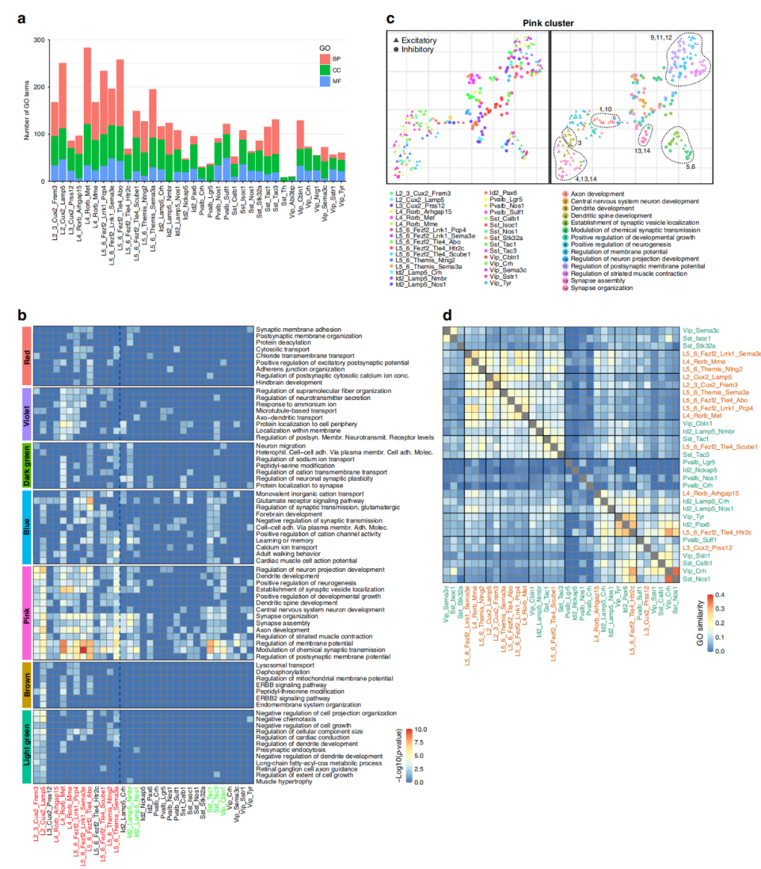 作者計算了每種已鑒定亞型GO中DE基因的富集程度,一些神經(jīng)元亞型在癲癇中表現出了大的轉錄組改變(>100豐富的GO),但多數神經(jīng)元亞型中只有少數GO,特別是對于生物過(guò)程(BP)來(lái)說(shuō),這應該與通路的生物學(xué)功能相關(guān)(圖2a)。這些受影響較小的亞型中,大多數在癲癇細胞和非癲癇細胞之間也具有高的基因表達相關(guān)性(圖1d),從而證實(shí)癲癇和非癲癇之間轉錄組相關(guān)性高的亞型中,癲癇改變的信號通路也較少。