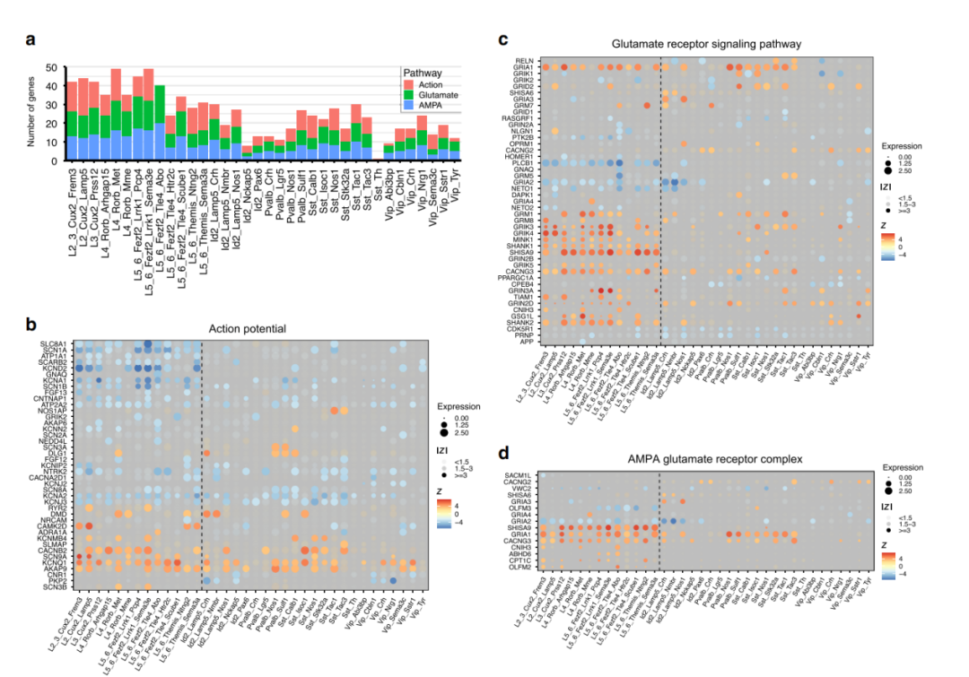 谷氨酸受體,尤其是AMPA受體被證明是癲癇發(fā)作的主要驅動(dòng)力之一,在篩選出缺乏表達的基因后,尋找富含與奮性相關(guān)轉錄組學(xué)變化的亞型,并從這些GO項中繪制DE基因(圖3a–d)。CKAMP44是貫穿整個(gè)顳葉皮質(zhì)的主要AMPA受體輔助亞基,這一事實(shí)也強調了CKAMP44上調的重要性(圖3c, d)。癲癇對AMPA受體輔助亞基編碼基因的上調有相當普遍的影響。