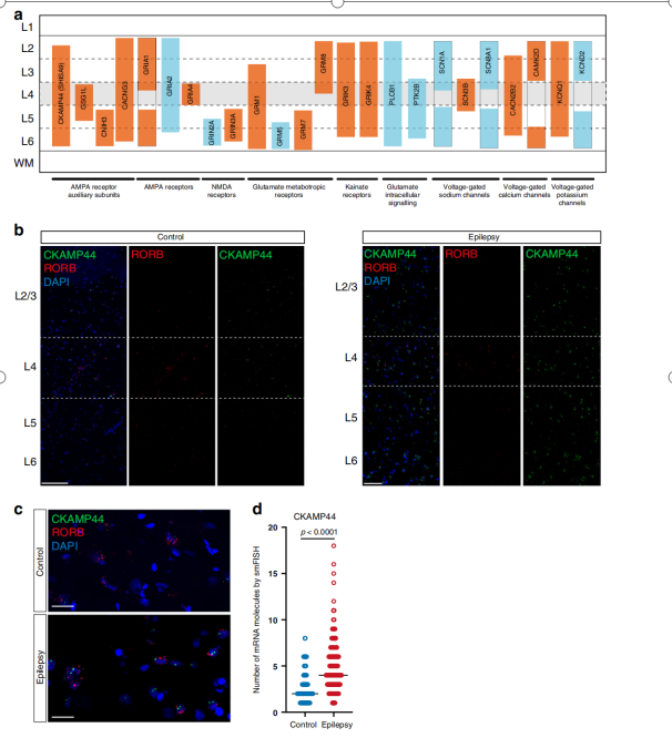 癲癇患者皮層谷氨酸介導興奮相關(guān)基因顯著(zhù)分層上調或下調。作者用單分子熒光原位雜交(smFISH)方法標記了幾個(gè)高度調控基因的mRNA。如上所述,在主要神經(jīng)元的亞型中,編碼AMPA輔助亞基的許多基因分層上調。因此,在一組癲癇和非癲癇樣本的皮質(zhì)切片中標記了CKAMP44 mRNA,通過(guò)與Rorb和DAPI共標記,并確定了L2/3、L4和L5/6的位置(圖4b)。重要的是,證實(shí)了各層中CKAMP44的表達顯著(zhù)上調(圖4b)。