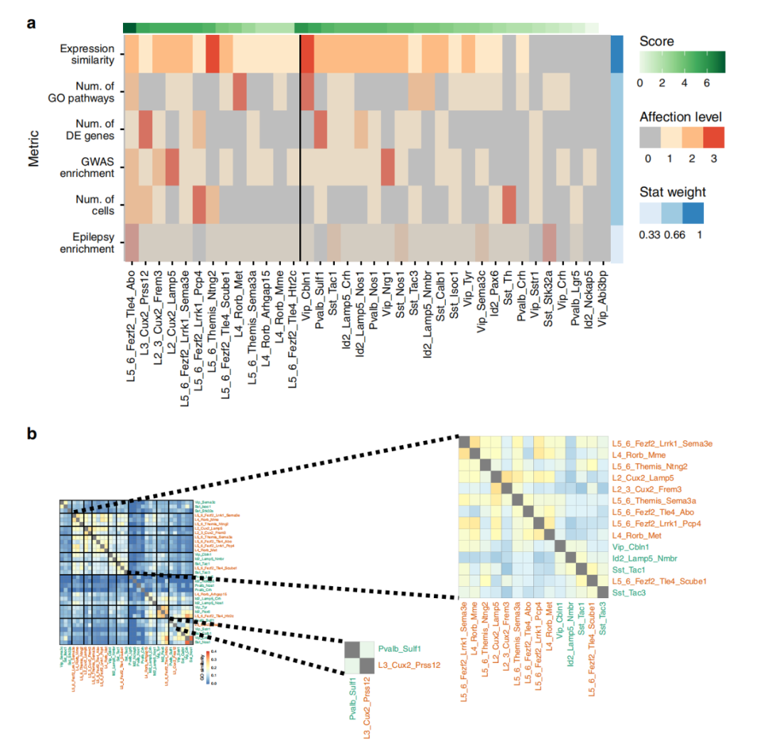 在癲癇樣本中,六個(gè)與癲癇密切相關(guān)的模塊上調,六個(gè)下調。另外,在細胞水平分析中突出的幾個(gè)涉及過(guò)度興奮信號和癲癇發(fā)作的基因也是一個(gè)或多個(gè)癲癇相關(guān)基因模塊的成員。編碼谷氨酸受體亞基的基因也廣泛存在于癲癇相關(guān)模塊中。這些基因共表達分析捕獲了主要神經(jīng)元L5-6_Fezf2_Tle4_Abo和L2-3_Cux2亞型中活躍的核心轉錄網(wǎng)絡(luò )。與癲癇狀態(tài)相關(guān)的基因模塊指向與突觸和離子通道相關(guān)的轉錄變化,包括AMPA受體輔助亞基、谷氨酸受體亞基和電壓門(mén)控鈉通道,這些可能與癲癇回路異常高的興奮有關(guān)。同時(shí)觀(guān)察到主要神經(jīng)元和GABAergic間神經(jīng)元的受影響的亞型根據豐富的GO項的相似性聚集在一起(圖5b)。因此,L2-3_Cux2和L5-6_Fezf2亞型與Sst_Tac1和Vip_Cbln1亞型共聚,而L3_Cux2_Prss12亞型與Pvalb_Sulf1亞型共聚,這可能是癲癇轉錄組中受影響嚴重的局部神經(jīng)網(wǎng)絡(luò )的基礎。
