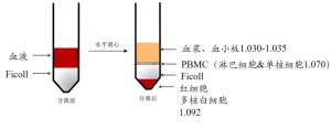 外周血單核細胞(Peripheral blood monoculear cell, PBMC)中大部分都是淋巴細胞(包括B細胞和T細胞),以及少部分的自然殺傷細胞和單核細胞,而紅細胞和血小板沒(méi)有細胞核,而粒細胞(granulocytes) 包括中性粒細胞、嗜堿性粒細胞和嗜酸性粒細胞,有多葉核,所以不包括在PBMC中。PBMC的制備采用密度梯度離心法,可通過(guò)Ficoll作為密度梯度介,使得不同密度的細胞在對應的界面處,然后通過(guò)快速離心,實(shí)現細胞分離。