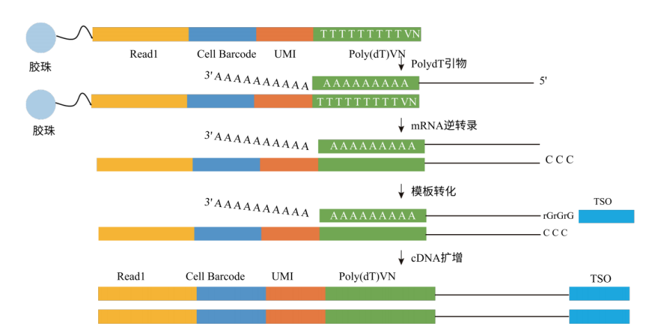 GEMs形成后,細胞裂解釋放出mRNA;同時(shí)膠珠也會(huì )自動(dòng)溶解,釋放出大量含有Barcode序列的引物,并利用引物末端的Ploy(dT)VN序列捕獲液滴中的mRNA,并在一個(gè)個(gè)GEM中獨立完成mRNA逆轉錄,產(chǎn)生帶有Barcode和UMI信息的cDNA。隨后“油包水”結構裂開(kāi),進(jìn)行cDNA擴增。