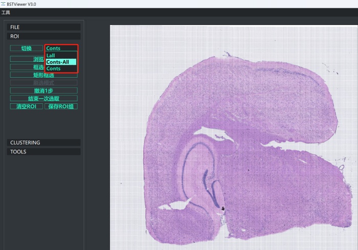4)進(jìn)行ROI 創(chuàng )建。點(diǎn)擊“ROI”按鈕,此處可以選擇全局聚類(lèi)和部分區域聚類(lèi)。cont和conts-all分別代表在全局下聚類(lèi)與全局扣除空白區域聚類(lèi)。區域聚類(lèi)的話(huà)目前提供了“框選模式”和“矩形框選”兩種模式??蜻x合適的區域后點(diǎn)擊“結束一次選取”,選擇“保存或摳除”,完成之后點(diǎn)擊“保存ROI組”并命名即可;