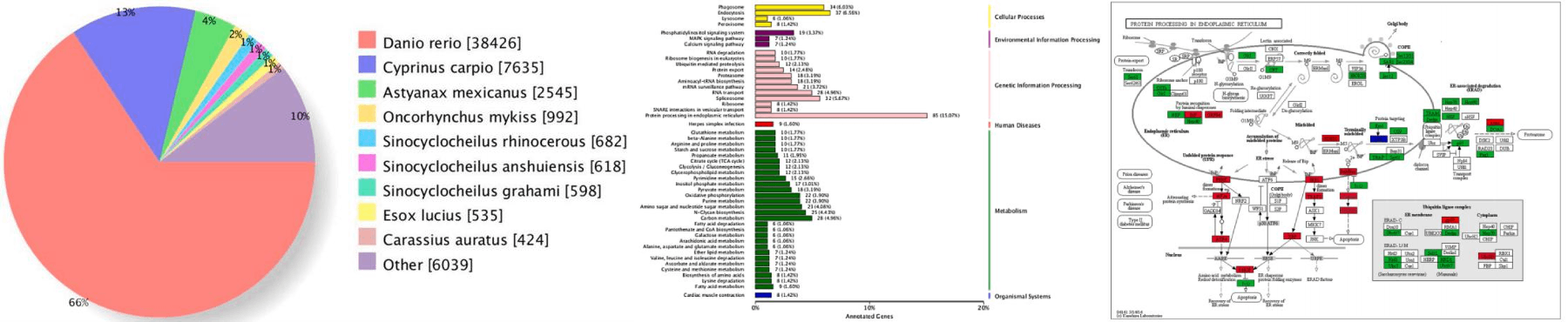 用RNA-seq技術(shù)研究氨脅迫下鯉魚(yú)肝胰腺的基因表達譜,共有3367個(gè)單基因被鑒定為與氨脅迫相關(guān)的差異表達基因(DEG)。1724DEG下調,1643DEG上調。KEGG分析將這些DEG的代謝