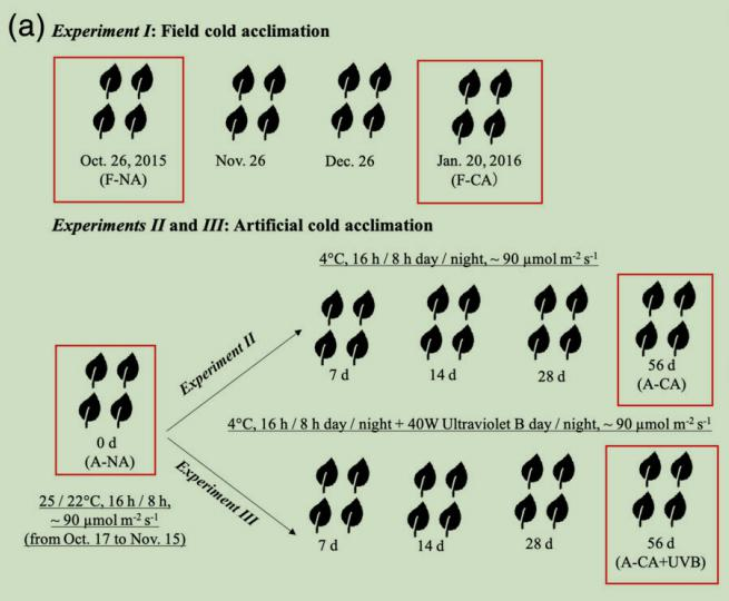 選3年生的“ElsieLee”杜鵑,用于田間或人工低溫馴化試驗,共3組試驗:ExperimentI田間低溫馴化(F-CA),ExperimentII人工低溫馴化(A-CA),ExperimentIII人工用紫外光B進(jìn)行低溫馴化(A-CA+UVB)。每組試驗36盆,分為3個(gè)生物學(xué)重復,每個(gè)生物學(xué)重復12盆,采集當年生長(cháng)的完全展開(kāi)的葉子進(jìn)行實(shí)驗,葉片在抽樣日期收集后立即在液氮中冷凍,然后-80℃保存。