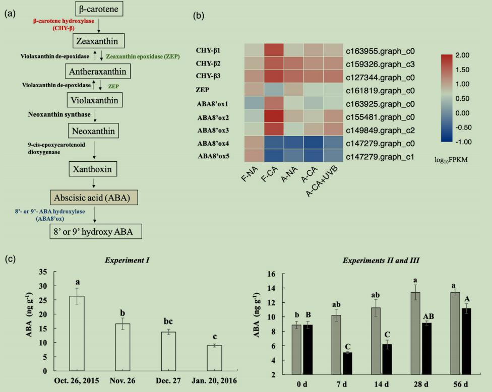 圖3(a)β-胡蘿卜素介導的脫落酸代謝途徑,(b)β-胡蘿卜素介導的脫落酸代謝途徑的DEGs熱圖,(c)田間(試驗I)和人工(試驗II和III)低溫馴化過(guò)程中葉片組織ABA含量的變化。