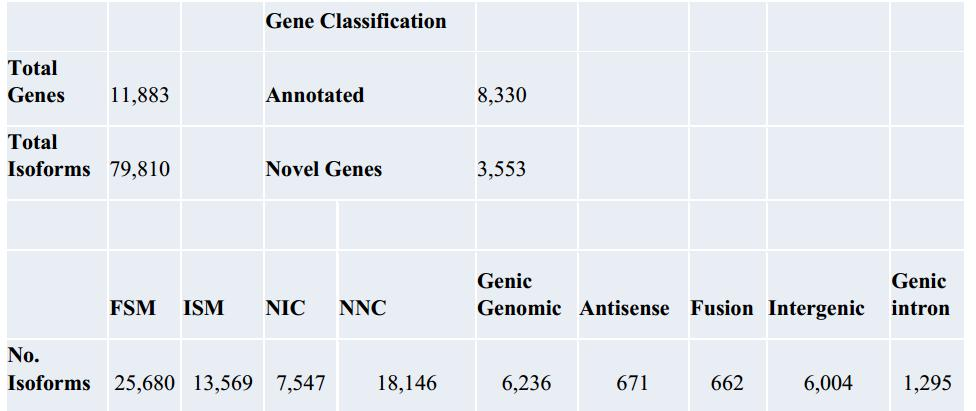 作者獲得了3100萬(wàn)次reads,其中使用Canu對2200萬(wàn)reads(71%)進(jìn)行了錯誤糾正,只關(guān)注全長(cháng)reads,通過(guò)確定為具有5’引物和poly(A)和3’引物的序列全長(cháng)序列。ToFU轉錄組結果包含總共11,883個(gè)基因和79,810個(gè)亞型(表北京百邁客生物科技有限公司1),其中8330個(gè)基因與NCBI注釋基因匹配,而3553個(gè)基因是新的。所有這些都對應于橄欖蠅轉錄組在同種型水平上比當前NCBI注釋的四倍擴增。針對UniprotSwiss-prot數據庫的預測蛋白質(zhì)序列的搜索顯示高比對的是雙翅目,其次是哺乳類(lèi)動(dòng)物(圖1B)。盡管鑒定了3553個(gè)新基因,但預計只有269個(gè)含有開(kāi)放閱讀框。與注釋基因相比,超過(guò)50%的新基因是單外顯子,其中超過(guò)80%的基因是多外顯子并且還包含更高百分比的單同種型基因。且新基因的表達量要低于已注釋基因。在結構上,SQANTI根據其剪接點(diǎn)和基因組坐標將轉錄本分為9類(lèi),分別為FSM,ISM,NIC,NNC,基因組基因,反義,融合,基因間區和基因內含子(圖1E)。