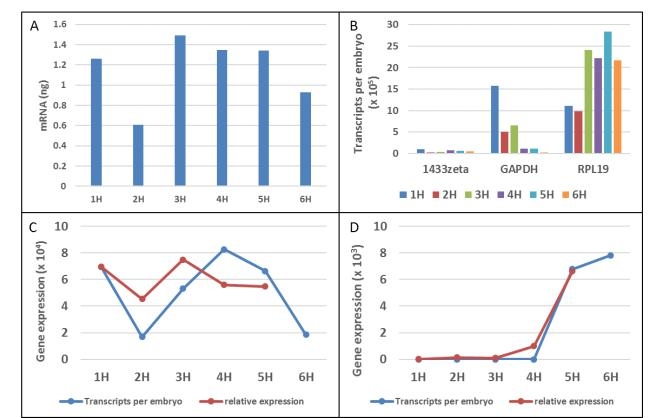 通過(guò)將每個(gè)胚胎的每個(gè)基因的所有轉錄物相加并計算以毫微克計的當量來(lái)計算每個(gè)胚胎的總mRNA(圖3A),總mRNA在1hpo時(shí)從1.2ng/胚胎下降至2hpo時(shí)為0.61ng/胚胎,然后在3hpo時(shí)增加至1.49ng/胚胎,然后在6hpo采樣結束時(shí)降至0.93ng/胚胎,反映了每個(gè)胚胎的總轉錄本(圖2D)。假設2-5%的總RNA是多腺苷酸化的,mRNA水平與我們在每個(gè)胚胎中獲得的總RNA產(chǎn)量一致。