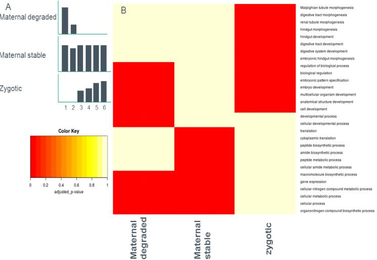 我們對3個(gè)類(lèi)別基因集進(jìn)行富集分析;母體降解基因,受精卵基因和母體穩定/上調基因。母體降解基因也是1hpo中表達高的基因,富含細胞過(guò)程,發(fā)育和新陳代謝(圖6)。母體降解的基因也富含轉錄因子,例如DREF,BEAF-32A,PNR,它們是相應的果蠅同源基因。類(lèi)似母體降解基因,母體穩定/上調基因在翻譯,生物合成過(guò)程,基因表達,代謝過(guò)程等方面得到豐富,反映了快速生長(cháng)胚胎的高代謝活性,DREF轉錄因子也在這些基因中富集。受精卵基因富含特定的組織形成和發(fā)展過(guò)程,包括:后腸發(fā)育,模式規范,消化道形態(tài)發(fā)生等功能。