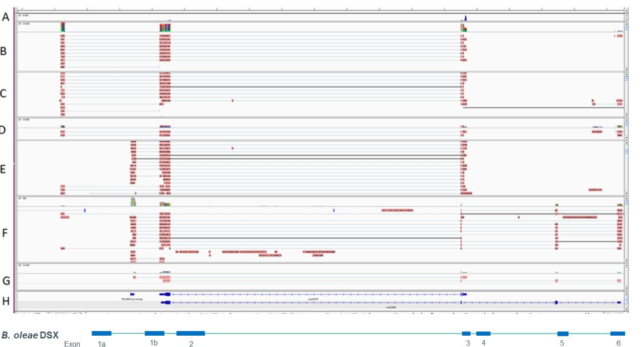 雙翅目昆蟲(chóng)的性別決定機制在很大程度上是相同的,在果蠅(Drosophilamelanogaster)中,性別決定機制已被廣泛研究,性致死基因(sxl)作為主要調節因子,根據性染色體與常染色體的比例,調節本身和變異基因(tra)的性別特異性選擇性剪接。tra反過(guò)來(lái)調節性別特異性雙重性別的選擇性剪接(dsx),這是級聯(lián)的最后一個(gè)成員和性別差異發(fā)育的中介。B.oleae同源物已經(jīng)鑒定了sx1,tra和dsx。然而,主要的調控方式仍然難以捉摸。已經(jīng)提出橄欖蠅的性別決定在胚胎發(fā)育的前6小時(shí)內發(fā)生,并且通過(guò)類(lèi)似于黑腹果蠅中的性別決定機制的tra和dsx的可變剪接來(lái)調控。在轉錄組數據中,我們能夠觀(guān)察到tra和dsx的各種可變剪接。使用來(lái)自成年雄性和雌性頭部的數據來(lái)識別性別特異性亞型。在dsx的情況下,與成齡相比,早期發(fā)育階段的亞型復雜性顯著(zhù)不同。在數據中,看到具有不同轉錄起始位點(diǎn)和長(cháng)度較長(cháng)的亞型,因為在發(fā)育的早期胚胎階段存在突出的亞型(圖8),成齡頭部組織中的這些亞型轉移到較短的亞型中,外顯子4存在于雌性中但不存在于雄性中。由于我們無(wú)法在早期胚胎階段檢測到這些性別特異性亞型,我們認為它們的表達在發(fā)育過(guò)程后期開(kāi)始。然而,它們在后期階段的積累代表了在發(fā)育早期階段激活的性別調控系統。北京百邁客生物科技有限公司。