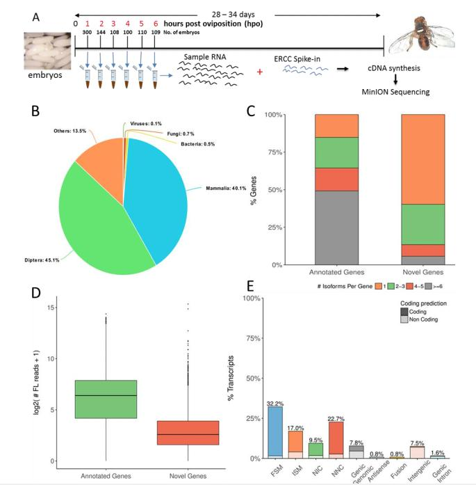 由于受精卵的興趣和令人費解的性質(zhì),胚胎發(fā)育已在模型生物中廣泛研究。然而,在生物中沒(méi)有很好表征,長(cháng)讀長(cháng)RNA-seq有可能揭示迄今未知的基因,完善注釋信息,并擴展亞型多樣性。作者匯集了混合性別橄欖果蠅(Bactroceraoleae)胚胎,這些胚胎在產(chǎn)卵的前6個(gè)小時(shí)后每小時(shí)收集一次。這些時(shí)期的研究很有意義,因為之前對B.oleae的研究表明,在此期間開(kāi)始通過(guò)基因的可變剪接介導的性別決定機制。此外,來(lái)自地中海實(shí)蠅(Ceratitiscapitata)的證據表明,在此期間發(fā)生極細胞(原始生殖細胞)的建立,因此,在此期間闡明轉錄狀態(tài)非常重要。
