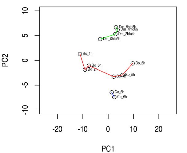 進(jìn)一步尋求確定觀(guān)察到的表達模式是否可以在不同的生物樣品組中重復并使用實(shí)時(shí)定量PCR(qPCR),這是當前用于量化基因表達的標準方法。然而,qPCR基因表達的相對方法需要鑒定內參基因其表達在樣品間保持穩定。使用作者的數據來(lái)確定這些常見(jiàn)內參基因以及GAPDH的表達水平的變化,評估了3個(gè)基因的qPCR表達;SRY,HID和LINGERER,用RPL19和14-3-3zeta作為內參基因,在不同的生物重復樣品組中(跳過(guò)6小時(shí)時(shí)間點(diǎn))。我們觀(guān)察到類(lèi)似的基因表達趨勢(特別是14-3-3zeta與RPL19相比)。為了進(jìn)一步探索表達譜,我使用差異表達的明顯的基因進(jìn)行主成分分析(PCA)和層次聚類(lèi)分析,第一個(gè)主成分將前3個(gè)時(shí)間點(diǎn)與最后3個(gè)時(shí)間點(diǎn)分開(kāi),分層聚類(lèi)進(jìn)一步表明前3個(gè)和后3個(gè)時(shí)間點(diǎn)是分別共同聚類(lèi)的。