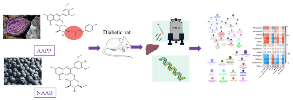 花色苷是植物中的一大類(lèi)多酚化合物,目前已知是對氧化應激、炎癥和能量穩態(tài)有調節作用。已有報道發(fā)現花色苷具有抗糖尿病的療效?;ㄉ盏暮诵慕Y構是花青苷,它可以糖基化形成非?;幕ㄇ嘬?,糖苷可以?;笮纬甚;幕ㄇ嘬?。且最近有研究表明,與未?;幕ㄇ嘬障啾?,?;ㄇ嘬站哂懈玫姆€定性和抗氧化活性。本研究利用全長(cháng)轉錄組學(xué)和核磁共振代謝組學(xué)方法,比較了非?;王;ㄉ諏μ悄虿〈笫蟾闻K基因表達和代謝的影響。這是第一次綜合應用這兩種強大的技術(shù)來(lái)研究肝臟基因表達和代謝產(chǎn)物的變化。