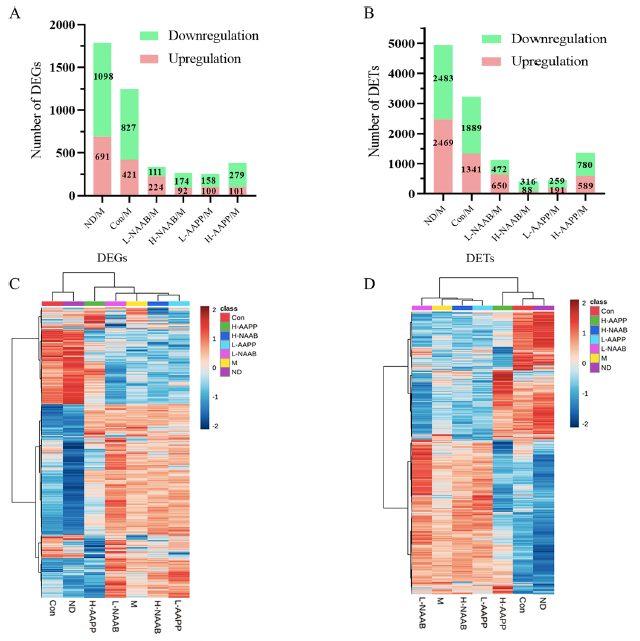圖1 DEGs(AC)及DETs(BD)的統計分析