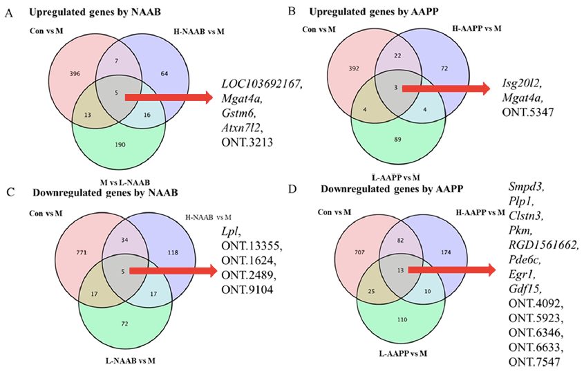韋恩圖表明了不同分組之間上調和下調的DEG的交集,揭示了受NAAB和AAPP影響的特定基因(圖2A?D)。Gstm6與谷胱甘肽代謝、藥物代謝以及細胞色素P450對外源物質(zhì)的代謝有關(guān),在胰島素抵抗和糖尿病小鼠中均被報道下調,并可能參與T2D的進(jìn)展。L-NAAB和H-NAAB均能恢復Gstm6的表達。與ND組和Con組相比,M組中有一個(gè)共同的基因被兩種花色苷提取物(NAAB和AAPP)上調,即編碼N-乙酰氨基葡萄糖轉移酶GnT-4a的Mgat4a。在小鼠中,Mgat4a基因的遺傳失活導致葡萄糖轉運蛋白2N-聚糖的錯誤組裝,導致葡萄糖轉運蛋白2和質(zhì)膜凝集素Galectin 9之間的相互作用失敗,導致葡萄糖轉運蛋白2內化,從而抑制葡萄糖攝取和葡萄糖刺激的胰島素分泌。還發(fā)現高脂飲食抑制了Mgat4a的表達。藍莓的非?;ㄉ蘸妥仙R鈴薯的?;ㄇ嘬斩际侨绱?。編碼脂蛋白脂肪酶的LPL在小鼠肝臟中過(guò)表達,導致肝臟甘油三酯含量增加2倍,并導致胰島素抵抗,部分原因是對胰島素的反應受損,抑制內源性葡萄糖的產(chǎn)生。在本研究中,L-NAAB和H-NAAB都下調了ZDF大鼠高水平的LPL,這可能導致胰島素敏感性的改善。早期生長(cháng)反應基因-1(Egr1)可被胰高血糖素短暫激活,介導胰高血糖素調節的糖異生。AAPP降低Egr1,這可能與糖異生減少有關(guān)。