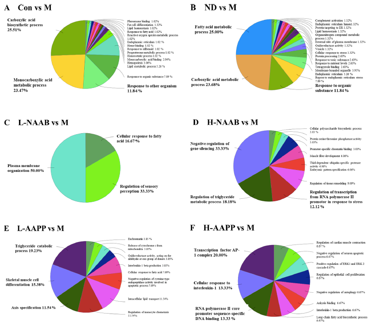 對不同分組中的DEGs進(jìn)行ClueGO分析,以生成按功能分組的注釋網(wǎng)絡(luò )圖(圖4A?F)。在CON/M差異分組的結果中,DEGs主要富集在羧酸生物合成過(guò)程、單羧酸代謝過(guò)程和對其他有機物的反應過(guò)程。在ND/M分組差異結果中,脂肪酸代謝過(guò)程、羧酸代謝過(guò)程和對有機物的反應過(guò)程是富集排名前3的功能分組。在ND/M和CON/M分組中,DEGs主要在單羧酸代謝過(guò)程、羧酸生物合成過(guò)程、脂肪酸代謝過(guò)程、脂肪代謝過(guò)程和對有機物的反應過(guò)程相關(guān)的通路中富集。在L-NAAB/M分組差異結果中,DEGs組要與三個(gè)功能通過(guò)有關(guān):質(zhì)膜組織、感覺(jué)調節和細胞對脂肪酸的反應。在H-NAAB/M差異結果中,DEGs主要富集于基因沉默的負調控、甘油三酯代謝過(guò)程的調控以及RNA聚合酶II啟動(dòng)子對脅迫反應的轉錄調控。在L-AAPP/M比較中,DEGs在甘油三酯分解代謝過(guò)程、骨骼肌細胞分化和軸規范方面都明顯富集。在H-AAPP/M差異結果中,發(fā)現轉錄因子AP-1復合體、細胞對白細胞介素-1的反應以及RNA聚合酶II核心啟動(dòng)子序列特異性DNA結合等通路顯著(zhù)富集。