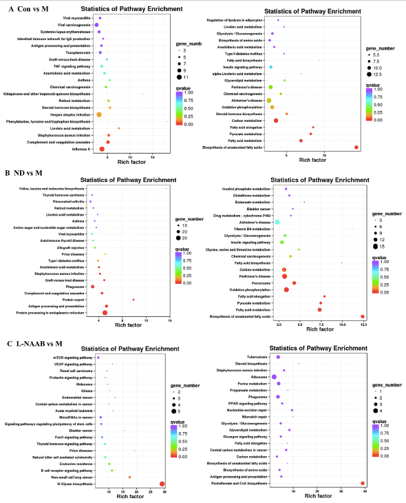 接下來(lái),進(jìn)行了KEGG通路富集分析。氣泡圖展示富集最顯著(zhù)的前20條通路(圖5A?F)。與M組相比,Con組上調的DEGs主要富集于以下通路:苯丙氨酸、酪氨酸和色氨酸的生物合成,亞油酸代謝,金黃色葡萄球菌感染,補體和凝血級聯(lián)反應,以及甲型流感病毒。ND組與M組相比,上調的DEGs主要富集在花生四烯酸代謝、金黃色葡萄球菌感染、移植物抗宿主病、吞噬小體等通路中,而ND組與M組相比上調的DEGs主要富集在以下通路:苯丙氨酸、酪氨酸和色氨酸的生物合成、亞油酸代謝、金黃色葡萄球菌感染、移植物抗宿主病、吞噬小體。在CON/M和ND/M比較中,下調的DEGs在相似的KEGG通路中富集:不飽和脂肪酸的生物合成、脂肪酸代謝、丙酮酸代謝、脂肪酸伸長(cháng)、氧化磷酸化和碳代謝。對于花色苷處理組,L-NAAB組上調的DEGs在N-糖鏈生物合成通路中顯著(zhù)富集。L-NAAB組下調的DEGs在泛酸和CoA生物合成通路中顯著(zhù)富集。在H-NAAB、L-AAPP和H-AAPP組中沒(méi)有發(fā)現下調的DEGs有顯著(zhù)富集的通路,在H-NAAB和L-AAPP組中上調的DEGs也沒(méi)有富集的通路。H-AAPP中上調的DEGs在補體和凝血級聯(lián)、不飽和脂肪酸和變形蟲(chóng)病的生物合成等通路中顯著(zhù)富集。