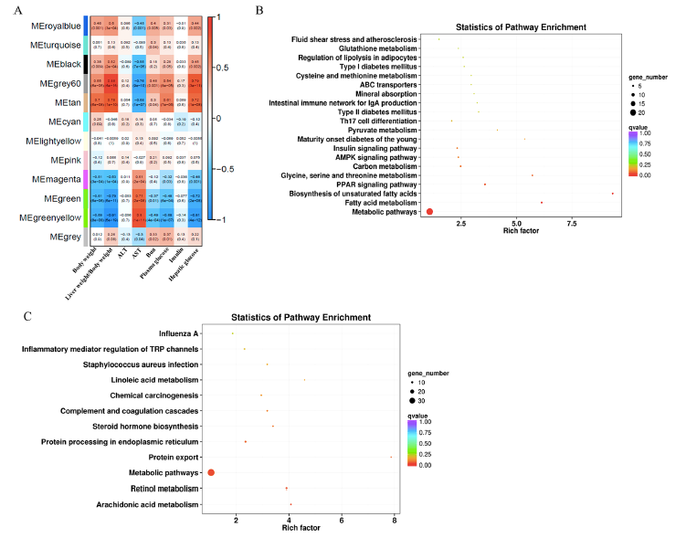 使用DEGs進(jìn)行WGCNA分析以確定共表達模塊及其與臨床特征的相關(guān)性。確定了12個(gè)共表達模塊,并與以前報道的各種臨床特征(體重、AST、ALT、血尿素氮、血糖和胰島素)相關(guān)(圖7A)。MEgery 60和MEtan模塊與體重、肝重/體重比、血糖、肝糖呈正相關(guān),與天冬氨酸轉氨酶呈負相關(guān)。MEgreen和MEgreenyellow模塊與體重、肝重/體重比、血糖、肝糖呈負相關(guān),與AST值呈正相關(guān)。接下來(lái),對MEgrey60和MEtan模塊以及MEgreen和MEgreenyellow模塊中的基因進(jìn)行了KEGG通路富集分析。結果發(fā)現MEgrey60和MEtan中的基因富集的通路主要涉及脂類(lèi)代謝(脂肪酸代謝、不飽和脂肪酸的生物合成、脂肪細胞脂解的調節)、氨基酸代謝(甘氨酸、絲氨酸和蘇氨酸代謝、半胱氨酸和蛋氨酸代謝、谷胱甘肽代謝)、糖尿病(青少年成熟期糖尿病、II型糖尿病、I型糖尿病、胰島素信號通路)(圖7B)。MEgreen和MEgreenyellow模塊中的基因主要富集在花生四烯酸代謝、視黃醇代謝、代謝途徑、蛋白質(zhì)輸出、內質(zhì)網(wǎng)蛋白質(zhì)加工、類(lèi)固醇激素生物合成、補體和凝血級聯(lián)、亞油酸代謝以及TRP通道的炎癥介質(zhì)調節(圖7C)。