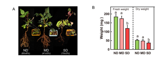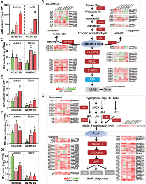 樣品做了三組處理:干旱處理0天(ND stress)、5天(MD stress)和10天(SD stress),并對光合作用進(jìn)行了檢測,同時(shí)檢測了脫落酸(ABA)和生長(cháng)素(auxin)的含量。