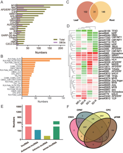 干旱脅迫顯著(zhù)改變了玫瑰葉片和根中與DEGs相關(guān)的279個(gè)轉錄因子的表達。MD和SD條件下,MYB、bHLH、b-ZIP、NF-Y、WRKY和AP2家族的TFs顯著(zhù)富集,其中MYB、AP2和WRKY占主導,差異表達的TFs分別為124、46和27個(gè)(圖5A)。bHLH和WRKY家族對干旱脅迫的響應非常相似。在MD-L處理中,有少量的DEGs、上調基因,但有大量的下調基因。相比之下,SD-L處理在這些基因家族中導致了更多的上調基因,并且適應干旱后的葉片和根的干旱響應的倍數變化通常低于SD處理。如圖5C所示,在干旱脅迫下,葉片和根中分別有133和177個(gè)TF基因差異表達(圖5 C),其中31個(gè)基因是兩個(gè)器官共有的且表達模式相似。例如,gene 6966和49627在MD和SD條件下,在葉片和根中都是表達上調。一些蛋白激酶家族,包括RLK/Pelle_DLSV(142個(gè)成員,玫瑰轉錄組中較大的家族)和RLK/Pelle_ RLCK -VIIa -2(101個(gè)成員)(圖5 B),在玫瑰轉錄組中負責蛋白激酶的大小。