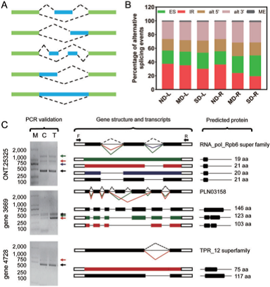 RNA-Seq檢測到的轉錄本與R.chinensis ‘Old Blush’基因組進(jìn)行比對,鑒定剪接異構體。如圖7 A所示,我們從非冗余轉錄本中檢測到42,544個(gè)可變剪接(As),包括12,096個(gè)內含子保留(IRs)、12,914個(gè)選擇性3’剪接位點(diǎn)(alt 3’)、7,433個(gè)選擇性5’剪接位點(diǎn)(alt 5’)、9,406個(gè)外顯子跳過(guò)(ES)和695個(gè)互斥外顯子(ME)(圖7 A)。IR在玫瑰葉片中最為常見(jiàn),在ND-L、MD-L、SD-L和ND-R樣品中的比例分別占34.77%、30.83%、30.1%和29.56%。而在SD脅迫下,ES是主要的AS模式(占所有AS事件的32.16%)。在MD-R中最常見(jiàn)的AS事件是alt 3’ (32.38%), ME(1.75%)是最罕見(jiàn)的(圖7 B)。為了進(jìn)一步驗證新發(fā)現的轉錄組剪接異構體,我們隨機選擇了三個(gè)至少注釋到兩個(gè)異構體上的基因(ONT.25325、gene 3669和gene 4728)進(jìn)行RT- PCR驗證。在這些基因的第一個(gè)外顯子和最后一個(gè)外顯子或適當區域設計引物。如圖7 C所示,片段的條帶大小與轉錄組數據中發(fā)現的剪接亞型的條帶大小一致。對推測的剪接異構體進(jìn)行克隆、測序和比對,以驗證剪接連接。例如,ONT. 25325編碼了一個(gè)putative protein,呈現出4個(gè)剪接亞型(圖7C),并隨后得到證實(shí)。此外,gene 3669和gene 4728顯示出相同的剪接變異。此外,一些剪接異構體,如gene 3669,在對照和干旱脅迫下表現出差異。新的可變剪接體的鑒定進(jìn)一步注釋了R.chinensis ‘Old Blush’基因組。