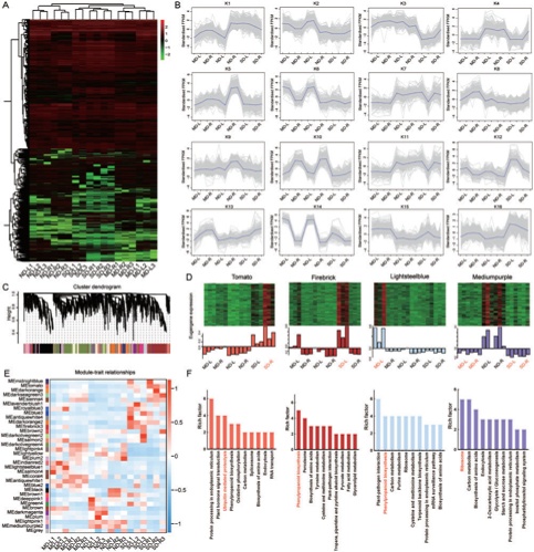 接下來(lái),根據RNA-seq數據鑒定了7101個(gè)DEGs,占本研究鑒定的所有基因的14.63% (7,101/48,549)。這些DEGs的熱圖表現出兩個(gè)保守組,如在干旱脅迫下誘導和抑制根和葉的表達模式(圖6 A)。然后使用K-means算法進(jìn)行富集分析,得到16個(gè)聚類(lèi)(K1-K16)(圖6 B)。在SD條件下,K12、K13和K16基因主要在葉片和根中表達,表明它們可能參與干旱脅迫。而在MD和SD處理下,K4、K5、K7、K9和K11基因在根和葉中均受到抑制。