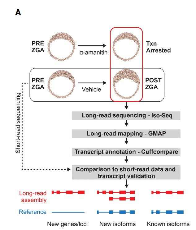 3、全長(cháng)轉錄組測序:選取正常的胚胎和 RNA 聚合酶抑制劑α-鵝膏毒素處理的胚胎進(jìn) 行三代全長(cháng)轉錄組測序。