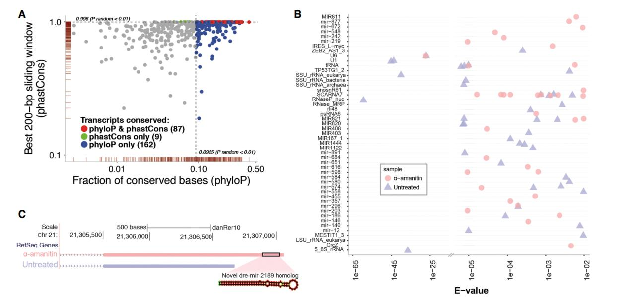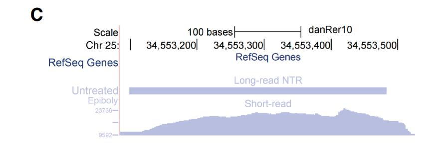 通過(guò)全長(cháng)轉錄組鑒定到的大量新轉錄本中包括了一種重要 miRNA- miR-430,mir-430 可能是第一個(gè)表達的合子基因,它通過(guò)對所有母源轉錄基因進(jìn)行的特異性沉默和降解將合子 基因的啟動(dòng)和母體程序的消除連接起來(lái)。在以前的研究中,對其功能研究較多,而對于 miR-430 的來(lái)源研究較少。作者鑒定到了一個(gè)新的跨越 9kb 基因組序列的四外顯子轉錄本, 該轉錄本重疊 22 個(gè) mir-430 重復序列,被稱(chēng)為“mega-mir-430”。 在α-amanitin 處理中沒(méi) 有檢測到 mega-mir-430,并通過(guò) qPCR 進(jìn)行了驗證,推斷它來(lái)源于合子基因組。從每個(gè) mega-mir-430 轉錄本產(chǎn)生多個(gè) mir-430 的拷貝,這個(gè)發(fā)現解釋了合子基因激活時(shí) mir-430 高表達的原因。