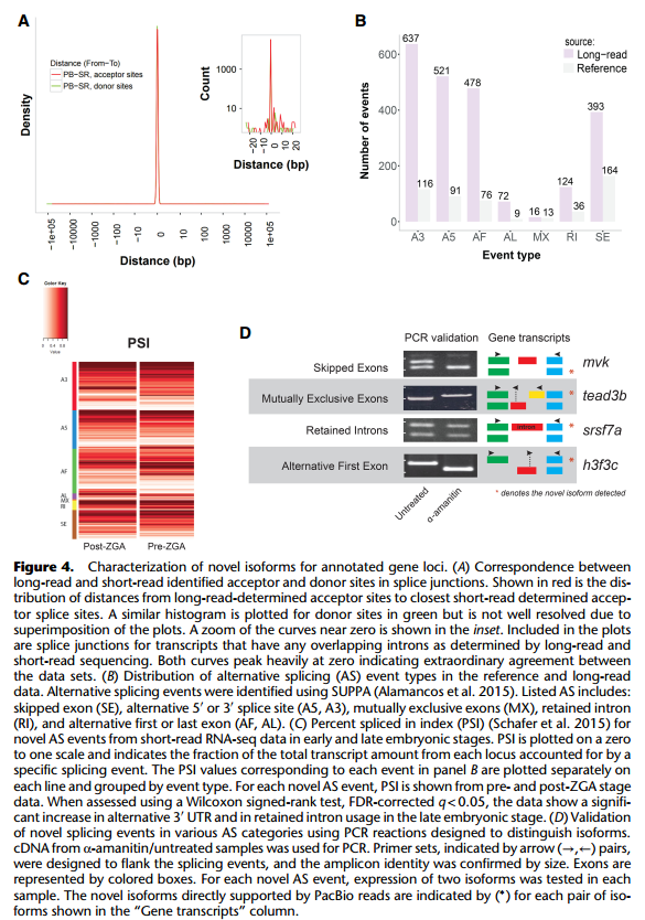 作者接著(zhù)對全長(cháng)轉錄組對已注釋基因鑒定到的未記錄的轉錄本的可變剪切形式的研究。 由于斑馬魚(yú)參考基因組對可變剪切的注釋較少,文章使用短讀長(cháng)的轉錄組數據對可變剪切位 點(diǎn)進(jìn)行驗證。作者使用 STAR 軟件分析轉錄組數據,預測了 3000 個(gè)可變剪切位點(diǎn),其中 99% 可以與全長(cháng)轉錄本數據吻合。剪接位點(diǎn)的這種近乎完美的一致性支持證明了全長(cháng)轉錄組鑒定 的外顯子 – 內含子邊界的準確性,并強烈支持新檢測到的可變剪接形式的有效性。通過(guò)全 長(cháng)轉錄組共發(fā)現了 2000 種新型可變剪切類(lèi)型,其中已注釋基因的新型可變剪切共 1835 中, 平均每個(gè)基因的可變剪切類(lèi)型提升 50%。