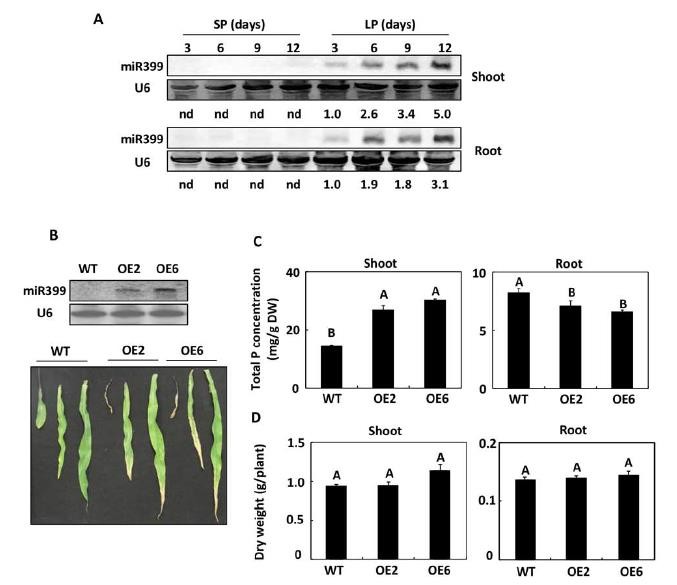 為了測定在P缺乏時(shí)ZmmiR399的表達,我們執行了一個(gè)隨Pi缺乏處理時(shí)間的增長(cháng),ZmmiR399在玉米根和地上部分表達情況的檢測,如圖1A。在Pi脅迫下,ZmmiR399的表達水平在玉米的根和地上部分都有大幅度的增加,且ZmmiR399的表達量肯定是和Pi缺乏的時(shí)間是相關(guān)的。