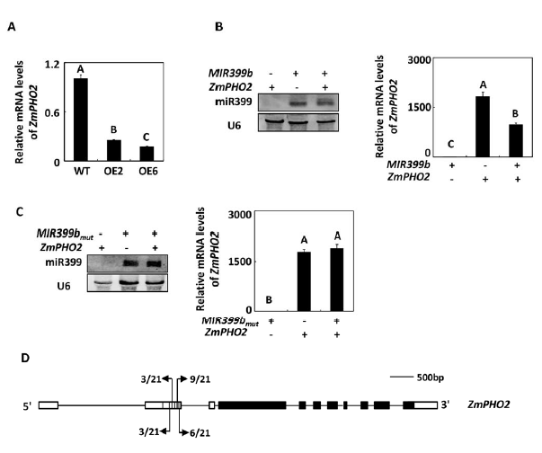 圖2:ZmPHO2被miR399轉錄后調控。A,qPCR檢測過(guò)表達轉化株的ZmPHO2轉錄本的表達;B、C,通過(guò)northernblot檢測MIR399b/MIR399bmut和ZmPHO2在煙草中的表達;D,通過(guò)5,RACE檢測ZmPHO2的切割位點(diǎn)