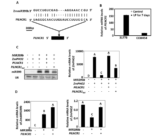 如圖5A,由于lncRNA819包含ZmmiRNAd的一段互補區域,所以它吸引了我們的注意力。使用3,和5,RACE,一個(gè)不包含內含子的677bp的cDNA的序列被克隆出來(lái)。如圖5B,在磷高效玉米CCM454和磷低效玉米31778植株中,lncRNA819被磷缺乏誘導顯著(zhù)表達,因此我們將lncRNA819叫做PILNCR1。