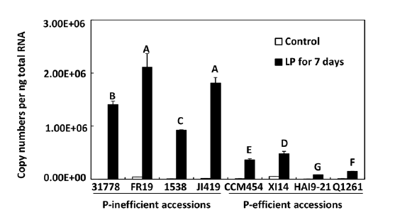 為了進(jìn)一步調查玉米低磷脅迫時(shí)PILNCR1的功能,我們通過(guò)RT-qPCR,檢測在磷高效玉米(CCM454、X114、HAI9-21、Q1261)和磷低效玉米(31778、FR19/1538、J1419)中PILNCR1的表達量。在pi缺乏條件下,在磷高效株和磷低效株中PILNCR1的表達量都是低的,見(jiàn)圖7。然而,當玉米收到低P脅迫7天后,磷低效玉米株中的PILNCR1的表達量是磷高效株中的6倍。