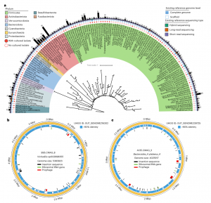 基于二三代測序混合組裝共獲得了802個(gè)CMAG,在準備本手稿時(shí),只有225個(gè)CMAG保存在公共基因組數據庫中。其中大多數(n=160)是從環(huán)境元基因組中重建的。該研究組裝的CMAG較大,從1.0 Mbps到5.5 Mbps(平均為2.4 Mbps),這個(gè)范圍涵蓋了大多數已知腸道細菌的基因組大小。為了評估目前組裝的CMAG的代表性,按照平均核苷酸同源性(ANI)95%閾值進(jìn)行物種水平基因組去冗余,然后將該數據集與統一人類(lèi)胃腸道基因組(UHGG)中去復制的基因組進(jìn)行比較??偣脖A袅?34個(gè)種水平的CMAG,涵蓋11個(gè)門(mén)、14個(gè)綱、27個(gè)目、45個(gè)科、94個(gè)屬(圖1A和補充表5)。其中有131個(gè)物種水平的CMAG是之前未報道的環(huán)狀的、完整、人類(lèi)特有的各自物種的代表性基因組,65個(gè)未培養物種的參考基因組的質(zhì)量得到了改善。這些結果表明了當前工作流程在從復雜的宏基因組數據集和組裝挑戰的區域組裝完整基因組方面的能力和有效性。