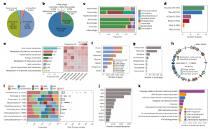 接下來(lái),對IMGG數據庫中的前噬菌體基因組進(jìn)行深入分析,以探究其功能能力。從12834個(gè)物種水平的vOTU代表性基因組中鑒定出596193個(gè)蛋白質(zhì)編碼基因,并將這些假定基因與幾個(gè)常見(jiàn)的功能和/或病毒注釋數據庫進(jìn)行了比較。結果表明,僅有55.4%的前噬菌體基因在功能上能夠被分類(lèi),而44.6%的基因與任何交叉比較的數據庫都不具有同源性,被分配給了未知的功能(圖5d)。這些結果表明,盡管攜帶ARG的噬菌體很少存在于腸道微生物中,但這些噬菌體可能編碼ARG(例如,A163.CMAG_1_1_7_59800編碼假定的β-內酰胺酶基因;圖5h),可能成為ARG轉移的關(guān)鍵載體,并對人類(lèi)健康造成嚴重威脅。這些結果表明,腸道前噬菌體在分類(lèi)和功能上比先前我們所了解的更加多樣化。