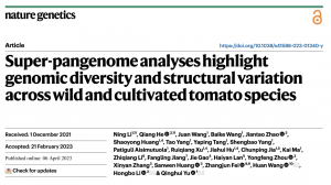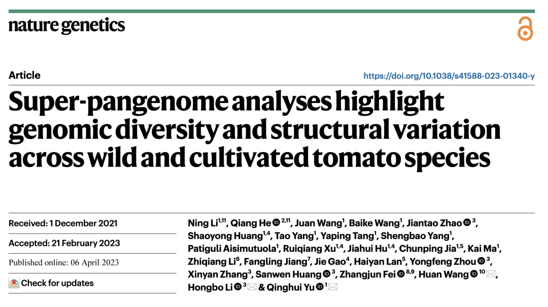 2023年4月6日,Nature Genetics《自然·遺傳學(xué)》發(fā)表了由新疆農業(yè)科學(xué)院園藝作物研究所牽頭,中國農業(yè)科學(xué)院深圳農業(yè)基因組研究所、作物科學(xué)研究所、生物技術(shù)研究所等團隊合作完成的題為Super-pangenome analyses highlight genomic diversity and structural variation across wild and cultivated tomato species的研究論文。該研究繪制了11個(gè)野生和栽培番茄的染色體級別高質(zhì)量基因組圖譜,闡明了茄屬番茄組(Solanum?section?Lycopersion)的基因組演化歷史,構建了番茄超級泛基因組/圖基因組,并進(jìn)一步在野生番茄中克隆到可大幅提升栽培番茄產(chǎn)量的新基因一個(gè)。該研究既是對番茄基因組資源的重要補充,同時(shí)也對其它作物基因組學(xué)研究和野生種質(zhì)資源尤其是近緣野生種的利用具有重要啟發(fā)意義。該成果也是新疆農業(yè)科學(xué)院首次以第一單位在Nature Genetics上發(fā)表長(cháng)篇研究論文。?百邁客為本研究提供了相關(guān)測序及分析服務(wù)。
