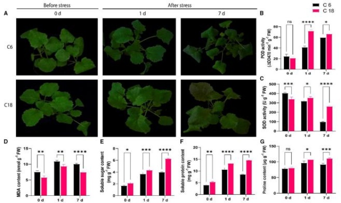 表型結果表明,C6 在冷處理 7 天時(shí)表現出比 C18 嚴重的萎蔫和褪綠。CT-C18 在第 1天和第 7 天的 SOD、POD 等抗氧化酶活性較高,C18 具有更好的抗氧化能力。并且 C18的可溶性糖、可溶性蛋白和脯氨酸含量都有顯著(zhù)升高。以上的現象都表明 C18 可通過(guò)增加CS 的抗氧化防御酶活性和滲透保護劑含量,降低氧化應激,是比 C6 更好的耐寒品種。
