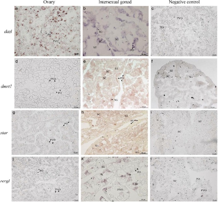 用原位雜交(ISH)技術(shù)分析了不同性腺階段性相關(guān)基因(dazl、Dmrt1、star、rergl)的定位。dazlmRNA僅限于斜帶石斑魚(yú)的雌性和雄性生殖細胞(卵母細胞、SG和SC)表達(圖9a、b),結果表明dazl是一種生殖細胞標記物,在睪丸中高表達,這與其他物種中dazl的表達一致。在自然雌性的卵巢中未檢測到Dmrt1信號(圖9d)。性逆轉后期的性腺有豐富的雄性生殖細胞SG、SC和ST,帶有dmrt1陽(yáng)性信號,而卵母細胞沒(méi)有dmrt1信號(圖9e),因此dmrt1可以被認為是斜帶石斑魚(yú)的生殖細胞標記。star作為合成類(lèi)固醇激素途徑中的限速酶,其在雄性斜帶石斑魚(yú)的睪丸中特異表達,而在卵母細胞中未檢測到star信號(圖9g)。此外,發(fā)現starmRNA在SG、SC和ST中表達(圖9h)。rerglmRNA僅在雄性生殖細胞中檢測到(圖9j,k),這與RT-qPCR結果一致,暗示其在性別調節中的潛在作用。dazl、dmrt1、star和rergl的雜交探針作為對照實(shí)驗顯示性腺中沒(méi)有信號(圖9c、f、I、l)。