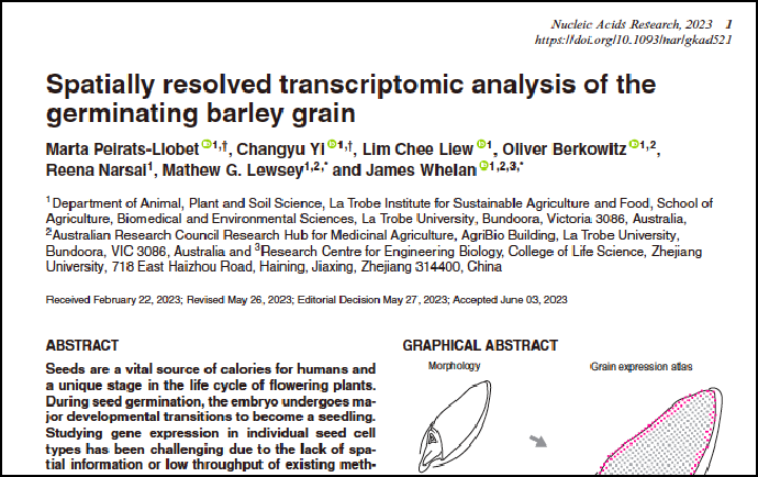 研究開(kāi)發(fā)了大麥種子萌發(fā)過(guò)程的空間轉錄組學(xué)流程,通過(guò)進(jìn)行高通量的空間基因表達分析,揭示了不同功能基因類(lèi)別在亞組織水平上的特定空間表達模式,為大麥萌發(fā)提供了空間解析細胞圖,并確定了特定的功能基因組目標,以更好地理解萌發(fā)過(guò)程中的細胞限制過(guò)程。