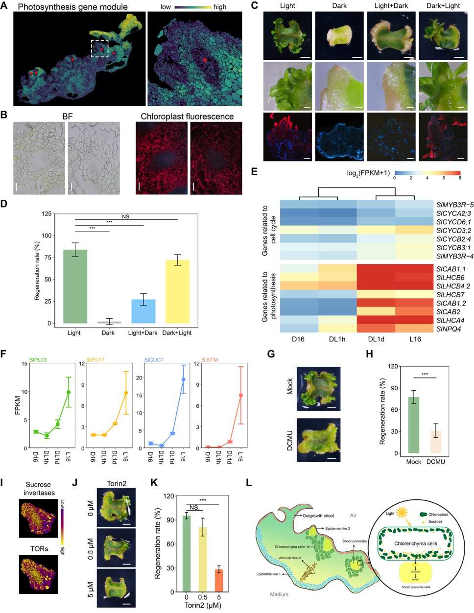空間轉錄組技術(shù)優(yōu)勢在于揭示不同細胞位置關(guān)系。研究團隊發(fā)現番茄愈傷組織的芽原基被表達光合基因的細胞包圍,相鄰細胞含葉綠體,稱(chēng)為綠色組織(chlorenchyma)細胞。黑暗后見(jiàn)光處理影響芽原基分化,光誘導綠色組織細胞對芽再生十分關(guān)鍵。光形態(tài)建成相關(guān)基因在芽原基和綠色細胞中卻無(wú)特定表達模式。光合抑制劑DCMU減慢芽再生速率,證明綠色細胞光合必要性。蔗糖可通過(guò)TOR信號調控芽原基發(fā)育,相關(guān)基因在芽原基位置高表達,綠色組織細胞蔗糖可傳輸至芽原基并激活TOR,促進(jìn)芽的分化發(fā)育。