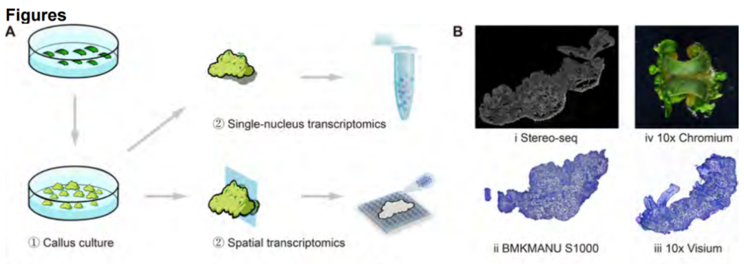 近日,北京大學(xué)現代農業(yè)研究院的李博生研究員團隊與鄧興旺院士團隊在國際學(xué)術(shù)期刊PNAS上發(fā)表了題為“Spatial transcriptomics reveals light-induced chlorenchyma cells involved in promoting shoot regeneration in tomato callus”的研究論文,建立了植物愈傷組織芽再生的空間轉錄組圖譜。該研究利用了百創(chuàng )智造 BMKMANU S1000,華大BGI Stereo-seq,美國10x Visium三種空間轉錄組技術(shù)以及10X Chromium單細胞核轉錄組技術(shù),揭示了番茄愈傷組織內部細胞的異質(zhì)性,并在單細胞水平上詳細解析了激素信號和重要調控因子在各種細胞和組織中的表達情況。研究結果不僅發(fā)現了表皮和芽原基細胞的亞型和功能,還揭示了綠色組織(chlorenchyma)細胞在芽原基細胞位置和分化發(fā)展中的重要作用,以及光照如何通過(guò)促進(jìn)綠色組織細胞的發(fā)育和激活雷帕霉素靶蛋白TOR來(lái)推動(dòng)芽再生過(guò)程。
