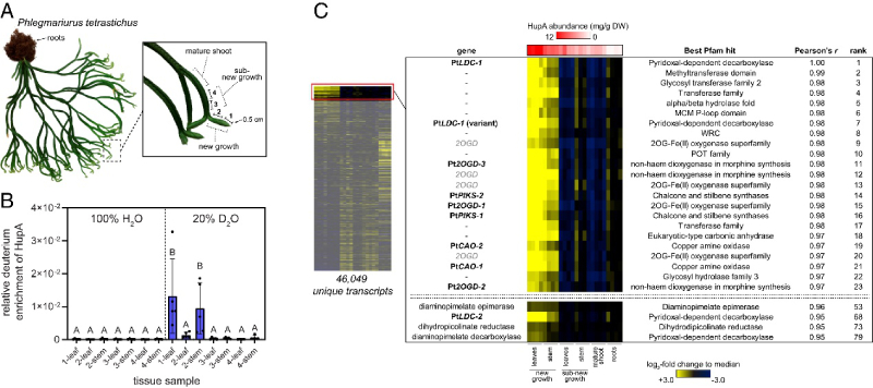 為了指導對石松生物堿生物合成的研究,作者重點(diǎn)關(guān)注 HupA,因為它已知具有作為 AChE 抑制劑的活性和作為藥物的潛力。HupA 由石松屬內的物種產(chǎn)生,但這些物種的 HupA 積累水平差異很大。作者推斷物種中 HupA 的增加可能與上調的生物合成基因表達有關(guān)。因此,檢測了石松屬的幾個(gè)物種的 HupA 含量,結果發(fā)現P. tetrastichus(圖 2A)積累了 HupA 到最高水平。因此,后續的研究將集中在該物種上。之前的研究表明,從頭 HupA 生物合成對P. tetrastichus枝條的新生長(cháng)具有特異性,接著(zhù)作者通過(guò)氘同位素標記實(shí)驗得到驗證,并且發(fā)現與莖相比,HupA標記在葉中更廣泛分布,表明這里的生物合成基因表達富集(圖2B)。因此,作者對對該物種的多個(gè)組織進(jìn)行了RNA-seq分析,揭示石杉生物堿生物合成基因在活性組織中的積累機制。