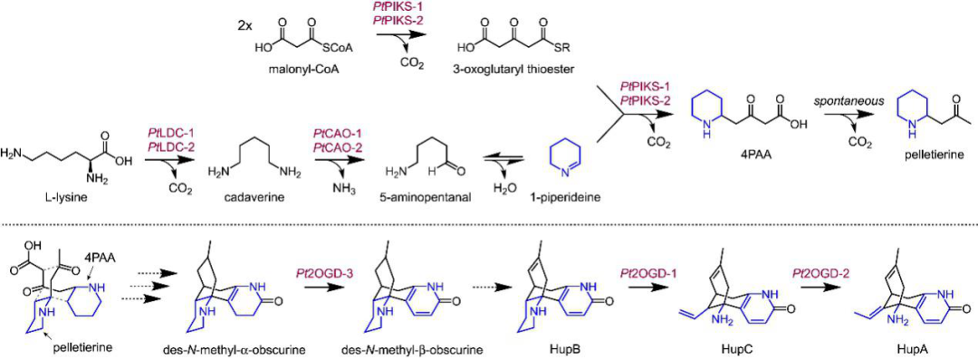 目前研究尚未證實(shí) HupA 生物合成中的任何下游中間體,但從各種苔蘚物種中分離生物堿可能與兩個(gè)含8碳哌啶的亞基摻入石松生物堿的生物合成相關(guān)(圖 1B)。但是詳細的代謝合成機制還不清楚。作者通過(guò)與4PAA/peletierine生物合成的 3 個(gè)高度共表達基因分析,作者發(fā)現了富集最顯著(zhù)的一類(lèi)酶:Fe(II)/2-氧代戊二酸依賴(lài)性雙加氧酶(2OGDs)(圖2B,C)。作者將這些高度共表達的2OGD作為下游石松生物堿代謝途徑中的強候選基因。
