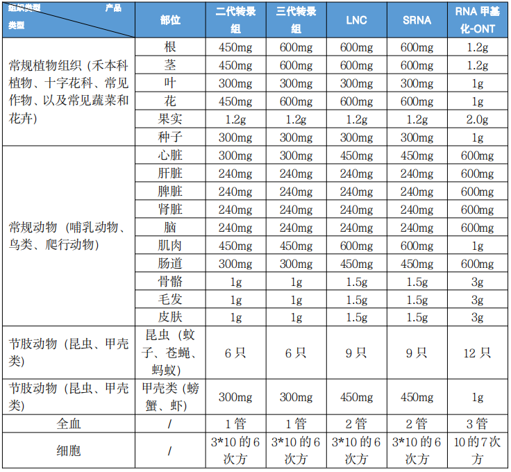 2) 組織送樣量:建議送樣量適用于 95%的物種組織,少部分組織因胞內核酸量較低,需適當增加送樣量,比如動(dòng)物皮膚、毛發(fā),植物果實(shí)、根等。請嚴格按照上方組織送樣量要求送樣,送樣量過(guò)少或過(guò)多均不利于提取實(shí)驗。采樣量較少會(huì )導致提取的 RNA 總量、濃度不合格,采樣量過(guò)多反而會(huì )造成速凍不徹底、提取取樣困難、凍融降解等危險。
