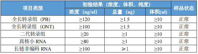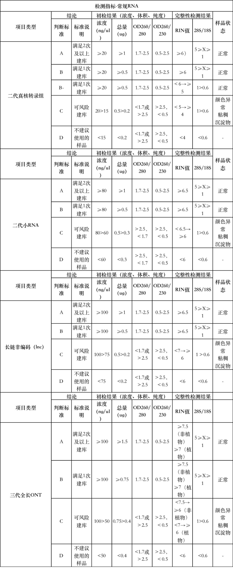 2、以上均是單個(gè)文庫的總量要求,如果樣品做多個(gè)文庫按(小 RNA>LNCRNA>轉錄組 RNA)判??偭坎蛔愕奈膸煊袠悠放?C 不通過(guò),無(wú)不合格原因,根據二次提取的總量判定。無(wú)樣品根據剩余總量判判定下一文庫。