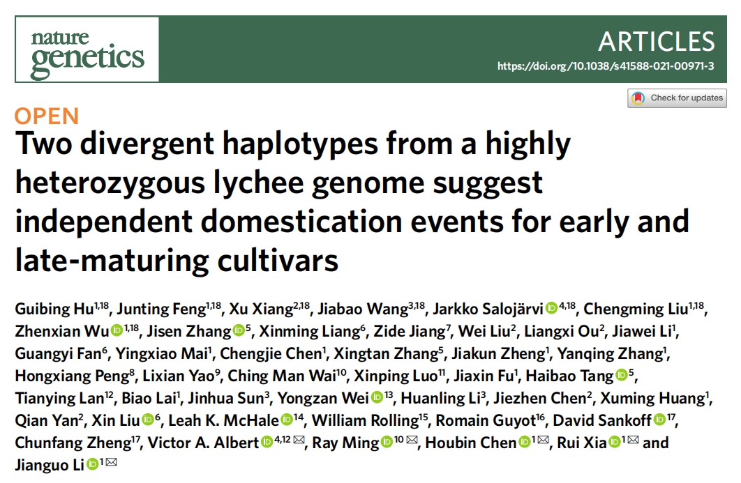 文章標題:Two divergent haplotypes from a highly heterozygous lychee genome suggestindependent domestication events for early and late-maturing cultivars