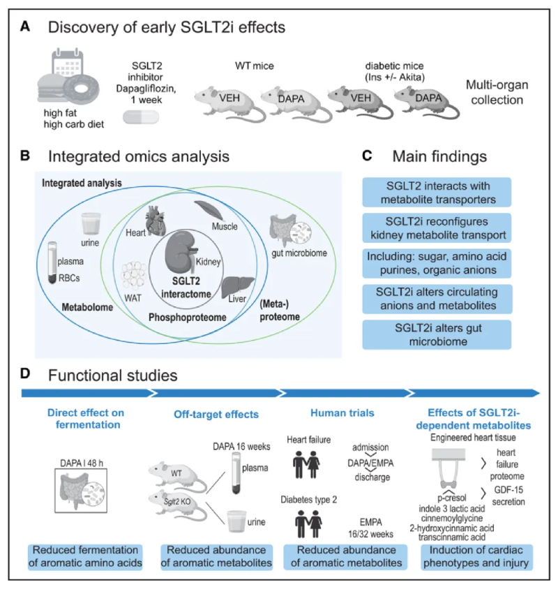 該研究旨在闡明SGLT2i的生理機制。作者假設大量的代謝器官通訊是對SGLT2i的反應而發(fā)生的,因此選擇了綜合組學(xué)方法。對非糖尿病小鼠的所有主要代謝器官、生物體液和腸道微生物群以及Akita小鼠單純性高血糖的早期階段進(jìn)行了綜合代謝組學(xué)和蛋白質(zhì)組學(xué)分析,Akita鼠是1型糖尿病的遺傳小鼠模型,長(cháng)期SGLT2i處理對其有改善作用(圖1A 和1B)。研究短期暴露于SGLT2i 1周,目的是確定主要代謝效應和可能建立保護作用的代謝通訊,而不是研究長(cháng)期治療后器官功能改善的后果。選擇高脂肪西方飲食(WD)是為了模仿西方生活方式的代謝環(huán)境。選擇達格列凈是因為其對患有和不患有糖尿病的患者具有心臟保護和腎臟保護特性。作者通過(guò)研究分析發(fā)現了一些意想不到的代謝信號(圖1C)。在后續研究中,將人腸道微生物培養物暴露于SGLT2i,使用SGLT2敲除 (KO) 小鼠來(lái)探測SGLT2i的脫靶效應,并在人腎、患者血漿和人誘導多能干細胞 (hiPSC) 中進(jìn)行翻譯驗證。同時(shí)在人腎、患者血漿和人誘導多能干細胞 (hiPSC)中進(jìn)行驗證(圖1D)。所得數據提供了關(guān)于SGLT2相互作用因子和SGLT2i依賴(lài)性蛋白質(zhì)組、代謝組、磷酸化蛋白質(zhì)組和元蛋白質(zhì)組的新見(jiàn)解,從而揭示了SGLT2i的下游通路,這也為代謝性疾病藥物的開(kāi)發(fā)提供了新思路。