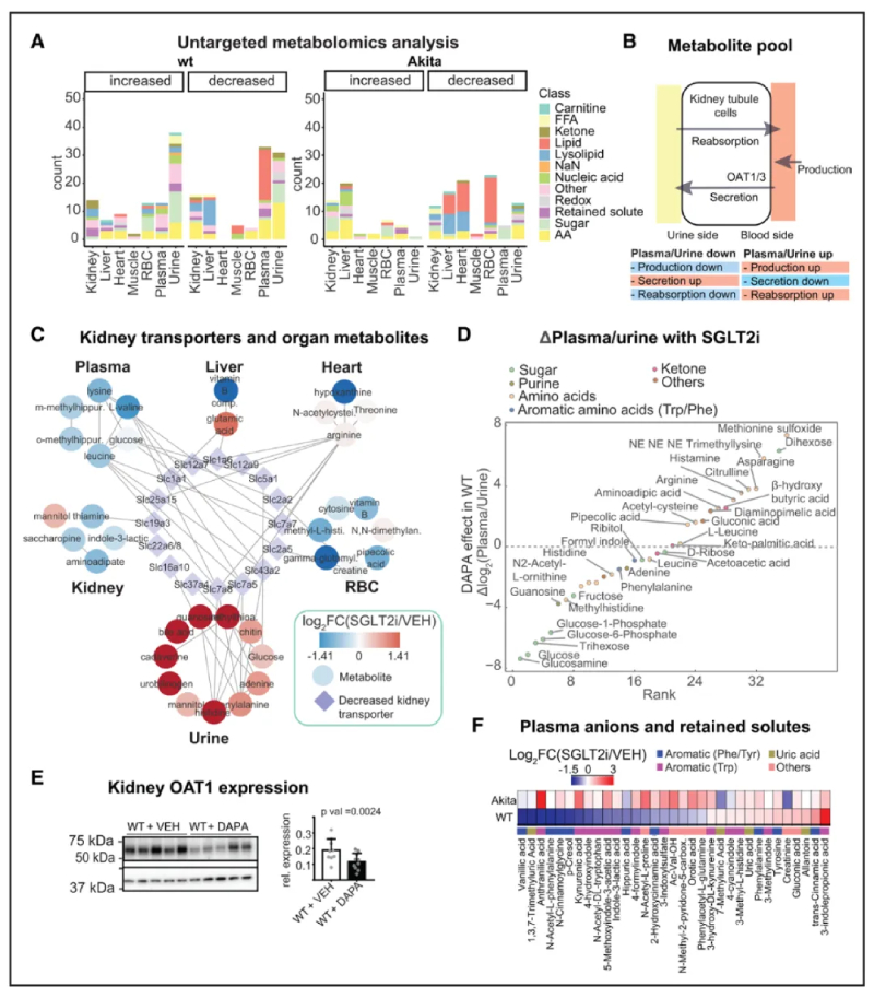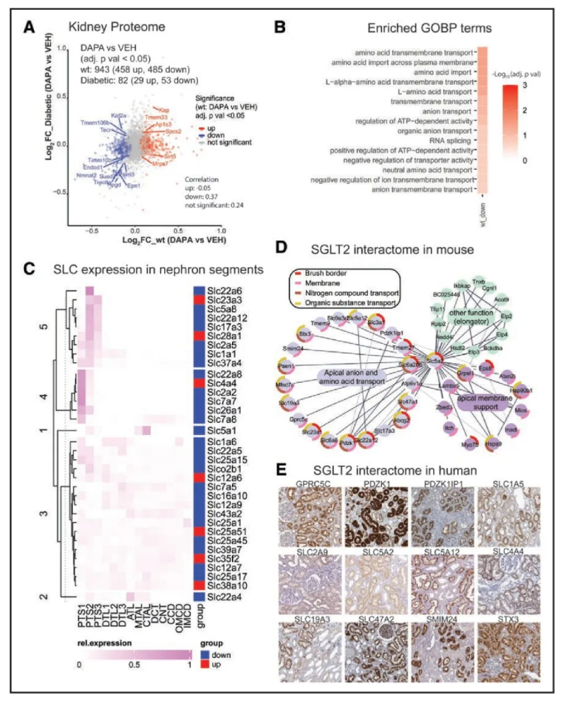圖2-綜合蛋白質(zhì)組/相互作用組分析表明SGLT2i對腎臟代謝產(chǎn)物轉運的廣泛重塑