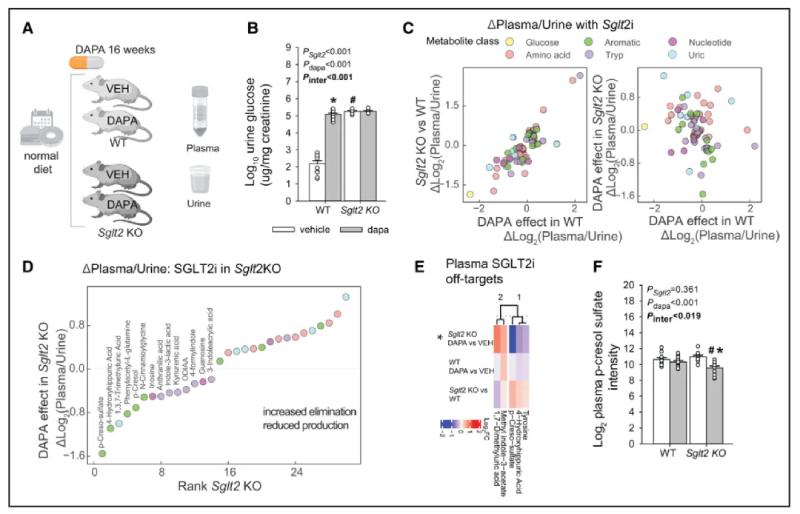 在SGLT2 KO和WT小鼠中,許多代謝物的比率發(fā)生了類(lèi)似的變化,就像在WT小鼠中使用達格列凈和溶劑處理一樣(圖5C左圖),這表明SGLT2抑制的后果。在其他方面,葡萄糖比率的下降,反映了尿糖排泄的增加。正如預期的那樣,SGLT2的缺失阻斷了達格列凈對葡萄糖排泄的影響(圖5C右圖)。另一方面,達格列凈顯著(zhù)改變了SGLT2 KO小鼠體內許多代謝物的比例,表明了一種偏離靶點(diǎn)的效應(圖5D)。血漿:尿液比例的排名變化顯示,達格列凈降低了SGLT2 KO小鼠中多種芳香酸代謝物的比例,包括甲酚和馬尿酸鹽,其次是色氨酸代謝物。血漿水平分析確定了SGLT2i在SGLT2 KO環(huán)境中顯著(zhù)改變的5種代謝物,包括PCL硫酸鹽和一種修飾的馬尿酸(圖5E和5F)。該實(shí)驗表明SGLT2i治療具有非靶點(diǎn)效應,包括對甲酚、馬尿酸鹽和色氨酸代謝物。