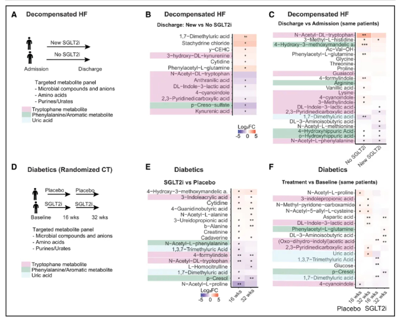 鑒于腎臟SGLT2相互作用組以及微生物對SGLT2i的反應在小鼠和人類(lèi)中相似,我們想知道SGLT2i是否會(huì )影響循環(huán)中的溶質(zhì),在縱向數據中與心血管相關(guān)。對來(lái)自2個(gè)獨立研究的患者的血漿樣本進(jìn)行了靶向代謝組分析,目標是80個(gè)有機陰離子和尿毒癥毒素。在第一組>40名患者中,在失代償性心衰的真實(shí)環(huán)境中分析了這種影響(圖6A)。結果表明,SGLT2i顯著(zhù)降低或鈍化了心力衰竭患者血漿中幾種有機陰離子的增加,但僅當住院期間添加SGLT2i時(shí)(圖6B和6C)。包括幾種色氨酸代謝物,如ILA、犬尿酸和乙酰色氨酸,以及苯丙氨酸代謝物苯乙酰谷氨酰胺和PCL硫酸鹽。分析了在糖尿病患者中使用SGLT2I(依帕列凈)的隨機對照試驗的縱向數據(圖6D)。與基線(xiàn)和安慰劑相比,二甲基尿酸和三甲基尿酸的血漿濃度降低,PCL降低,吲哚代謝物增加緩慢(圖6E和6F)。在兩項臨床研究中,降低的溶質(zhì)大部分來(lái)自嘌呤代謝和腸道芳香氨基酸代謝,這與在小鼠身上觀(guān)察到的代謝器官一致。